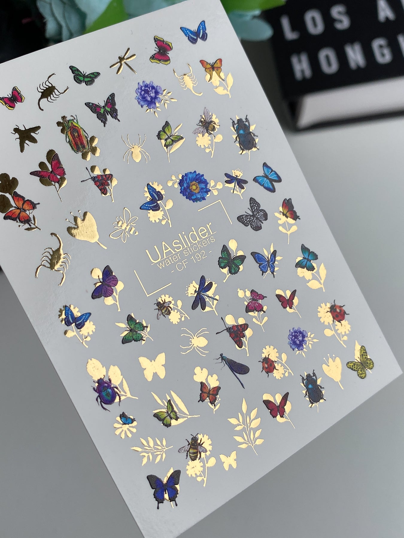 Unikátní vodní nálepky na nehty s barevnými motýly, brouky, vážkami a divokými květinami, zvýrazněné zlatými detaily. Perfektní pro manikúru inspirovanou přírodou nebo kreativní nail art.