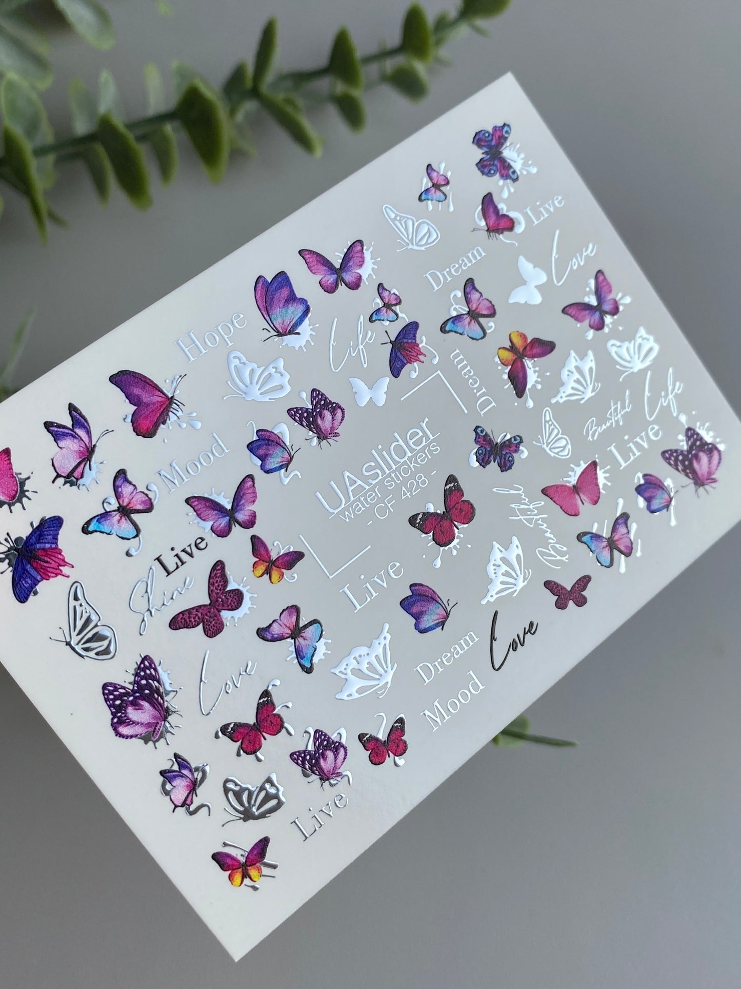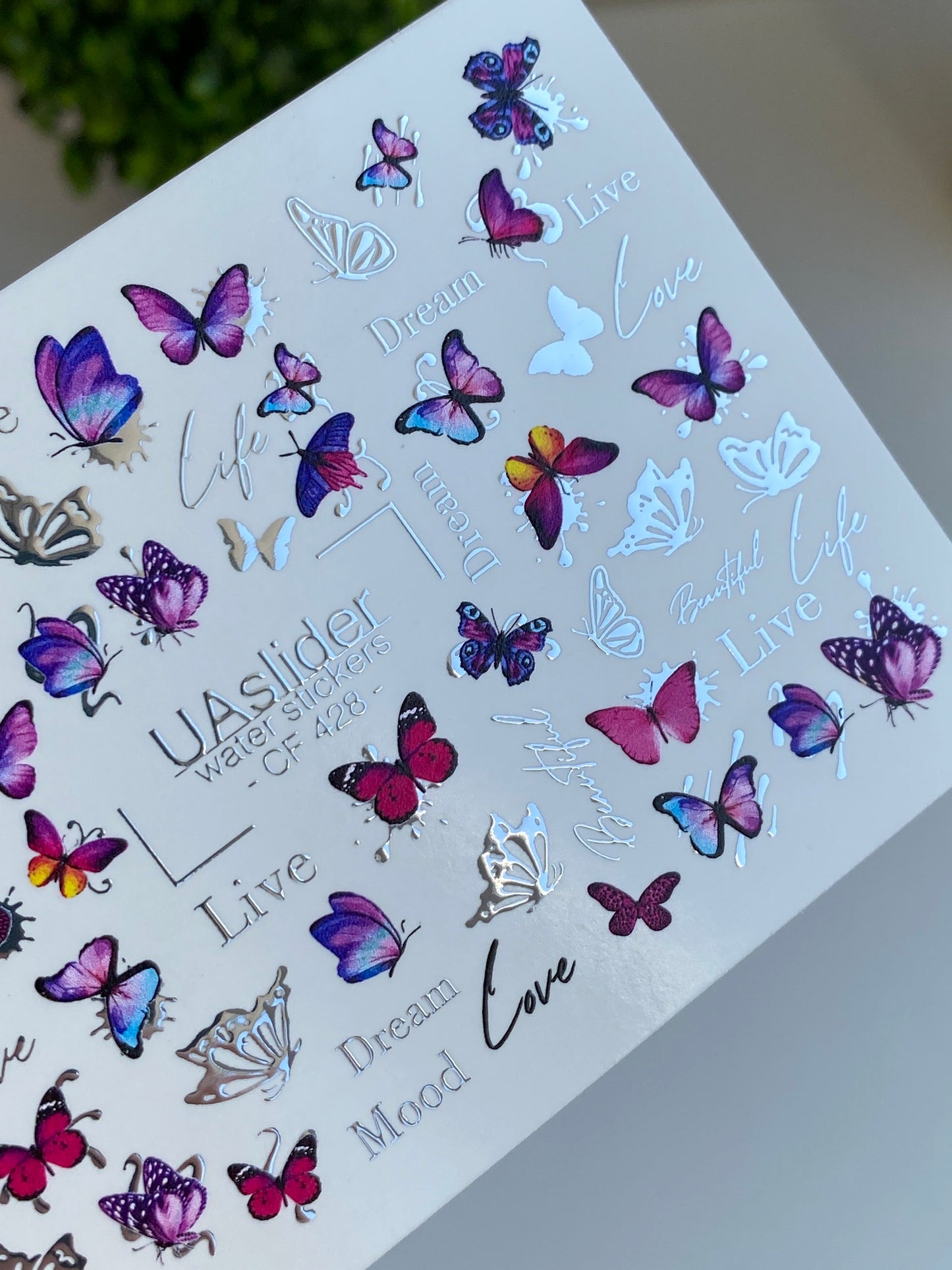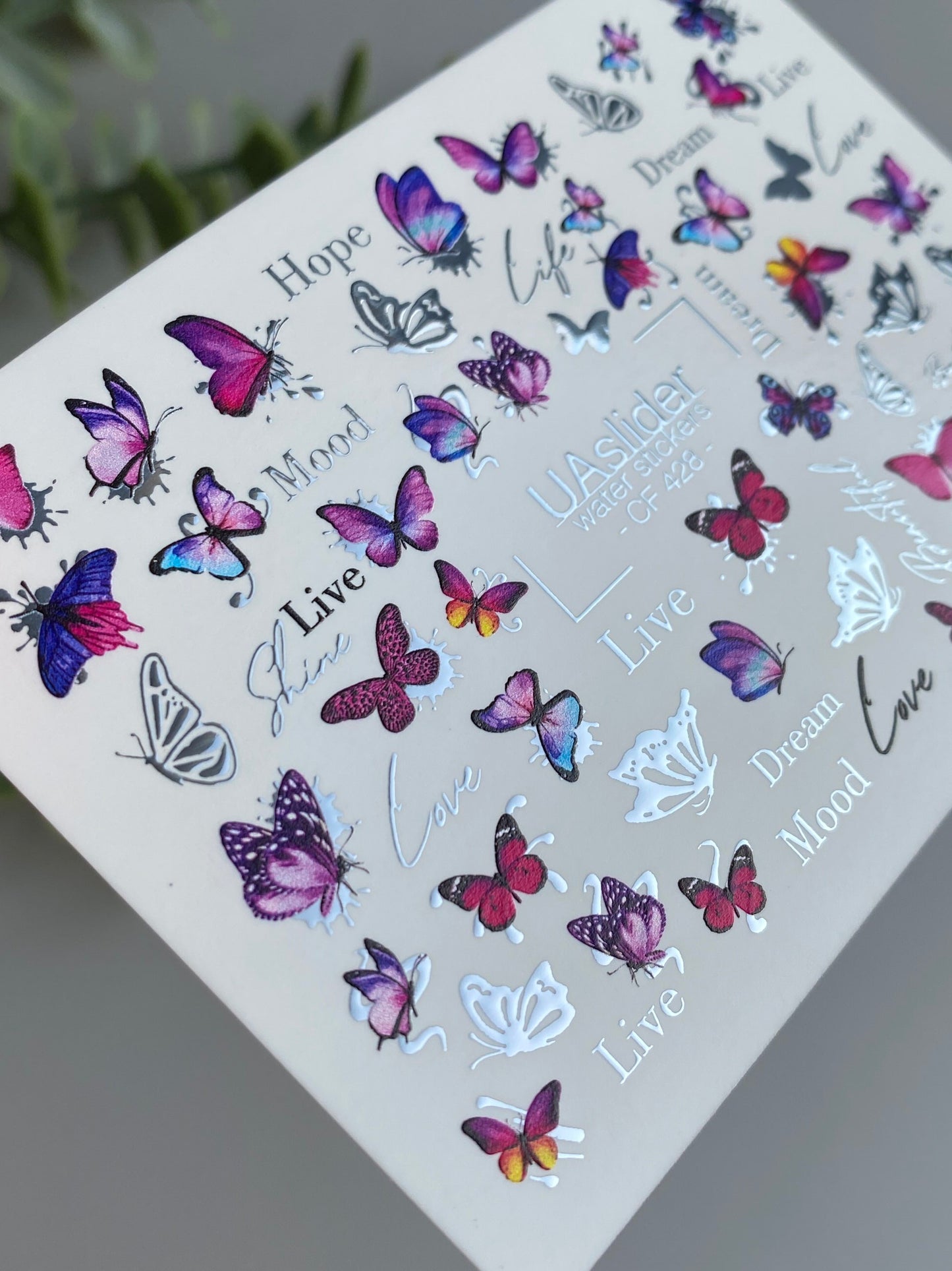Nálepka na nehty CF-428 | Nálepky na nehty s vodním posuvem růžoví a fialoví motýli | Citáty o snění, lásce a životěCF_428
