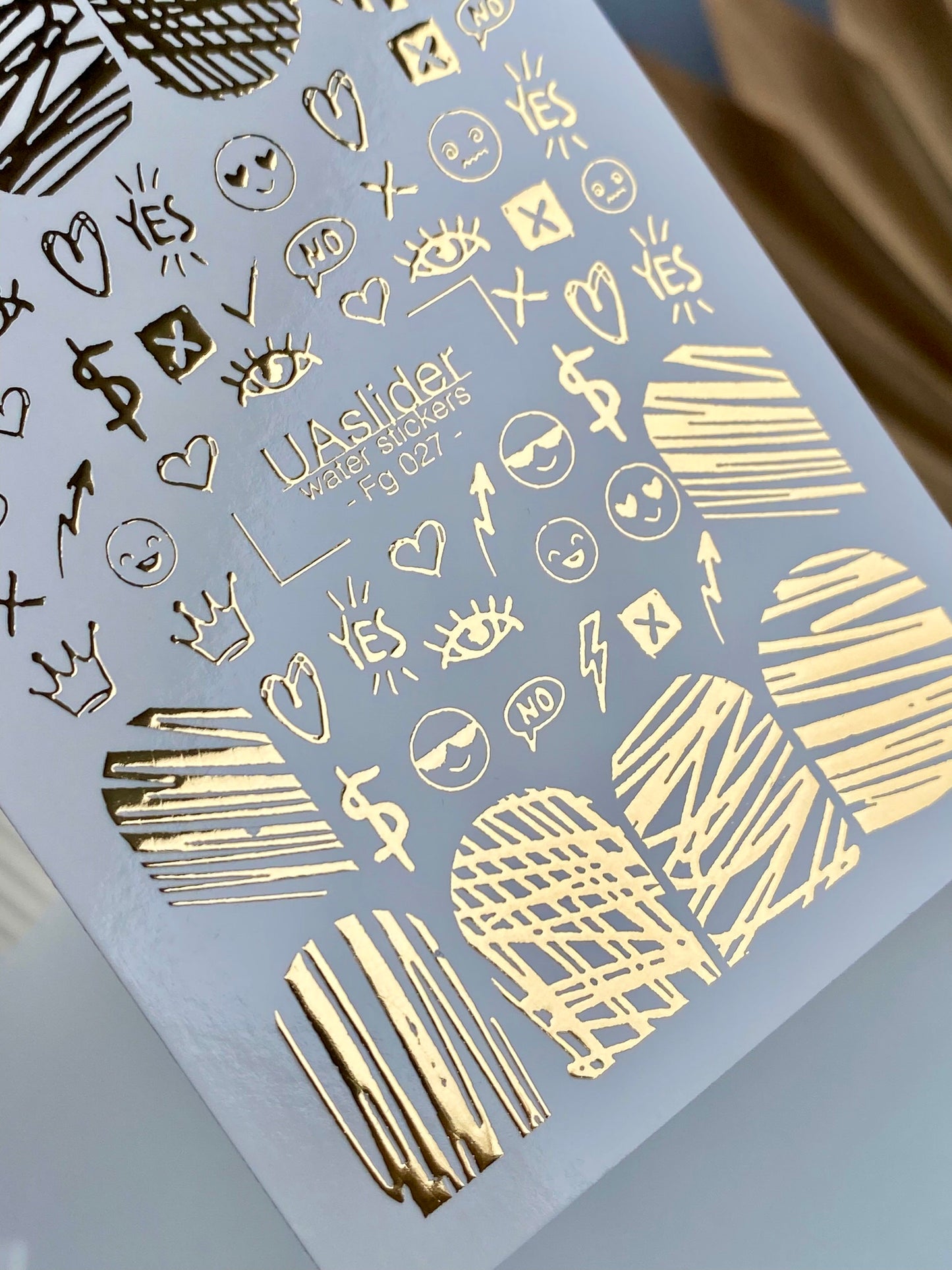 Nálepky na nehty Fg-027 | Abstraktní vodní nálepky na nehty se zlatou fólií | Plné textury nehtů a zábavné ikonyFg_027