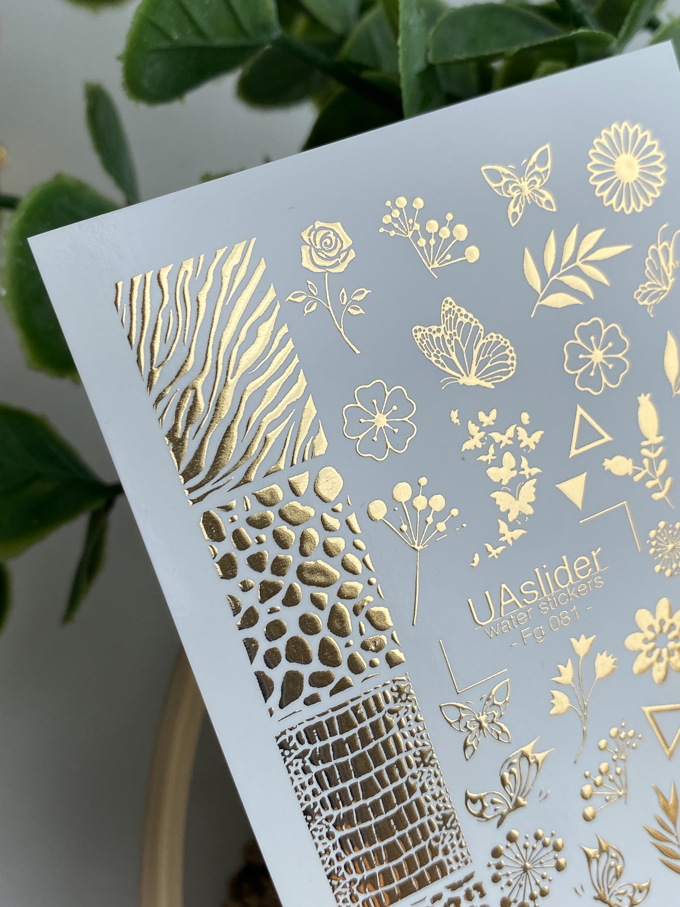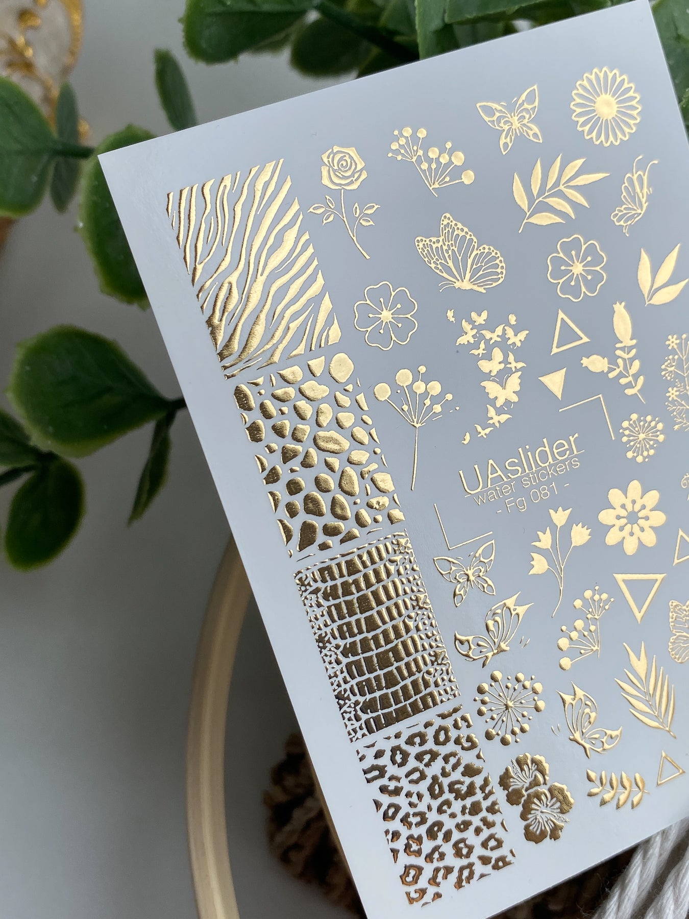 Zlaté fóliové vodní nálepky na nehty kombinující jemné květiny, listnaté větvičky, motýly a výrazné zvířecí vzory jako zebra, had a leopard. Tato jedinečná směs přírodních a módou inspirovaných motivů dělá každý manikúru výjimečnou.