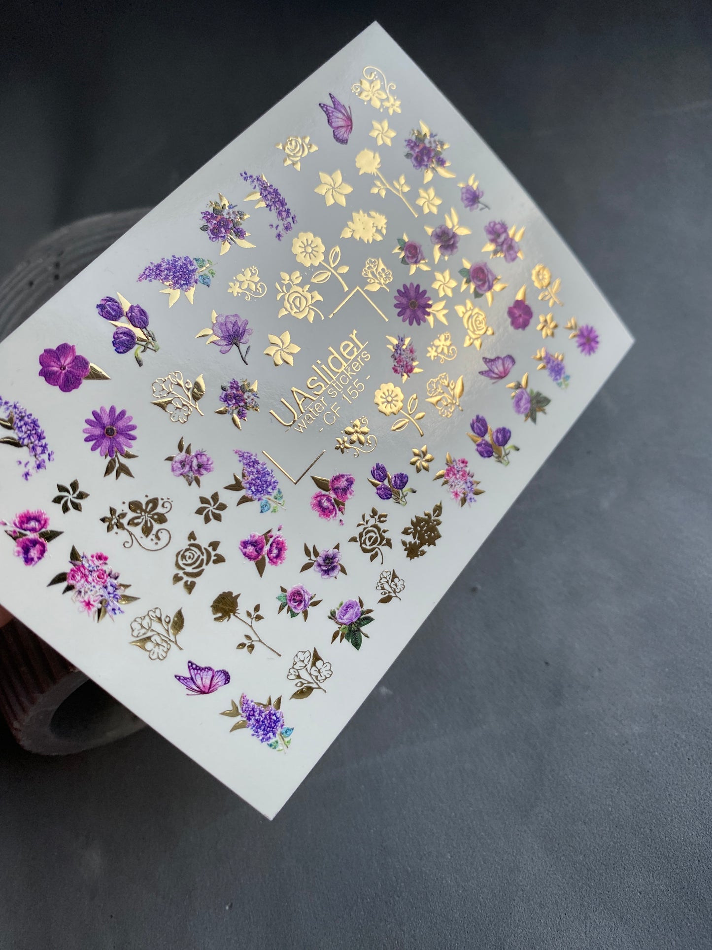 Lila florale Wasserabziehbilder mit Rosen, Lavendel, Astern und Schmetterlingen, veredelt mit goldenen Umrissen und dekorativen Akzenten. Eine zarte und romantische Wahl für feminine Nagelkunst.
