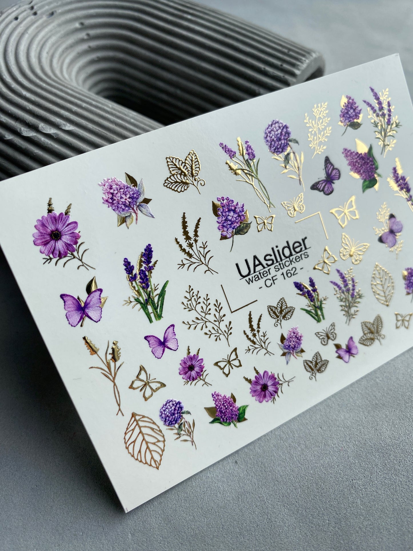 Nagel Wasserabziehbild CF-162 | Lavendel Wasserfolien Nagelabziehbilder | Lila Blumen, Schmetterlinge & Goldfolie Blätter