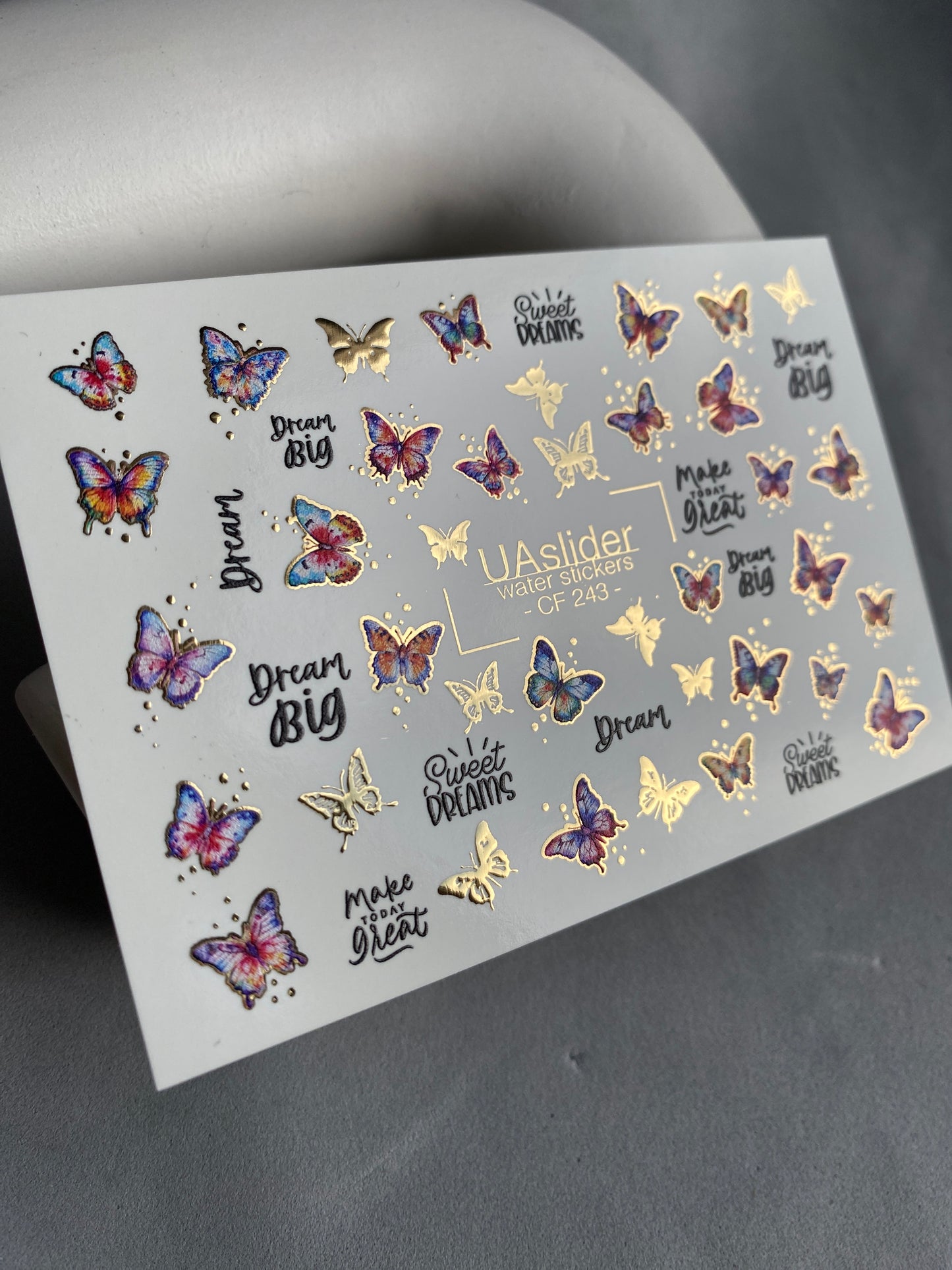 Bunte Schmetterlings-Wasser-Schiebefolien mit lebendigen Farbverläufen in Pink-, Lila- und Blautönen sowie schimmernden goldenen Details. Inspirierende Schriftzüge wie „Dream Big“ und „Make Today Great“ verleihen eine motivierende Note.