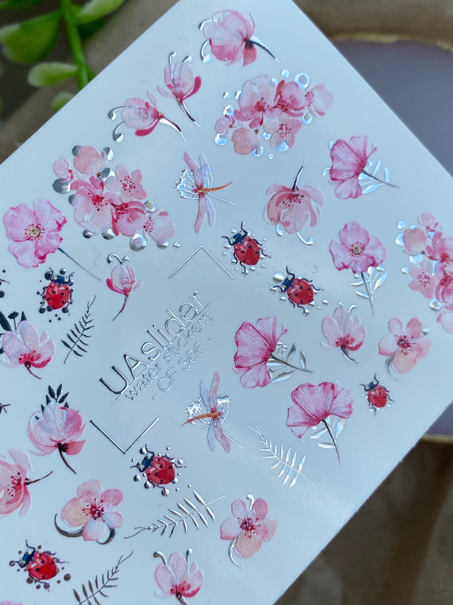 Charmante Wassertransfer-Nagelaufkleber mit zarten rosa Blumen, floralen Zweigen und niedlichen Marienkäfern. Eine perfekte Mischung aus Eleganz und Verspieltheit, die jeder Maniküre einen Frühlings- oder Sommerakzent verleiht.