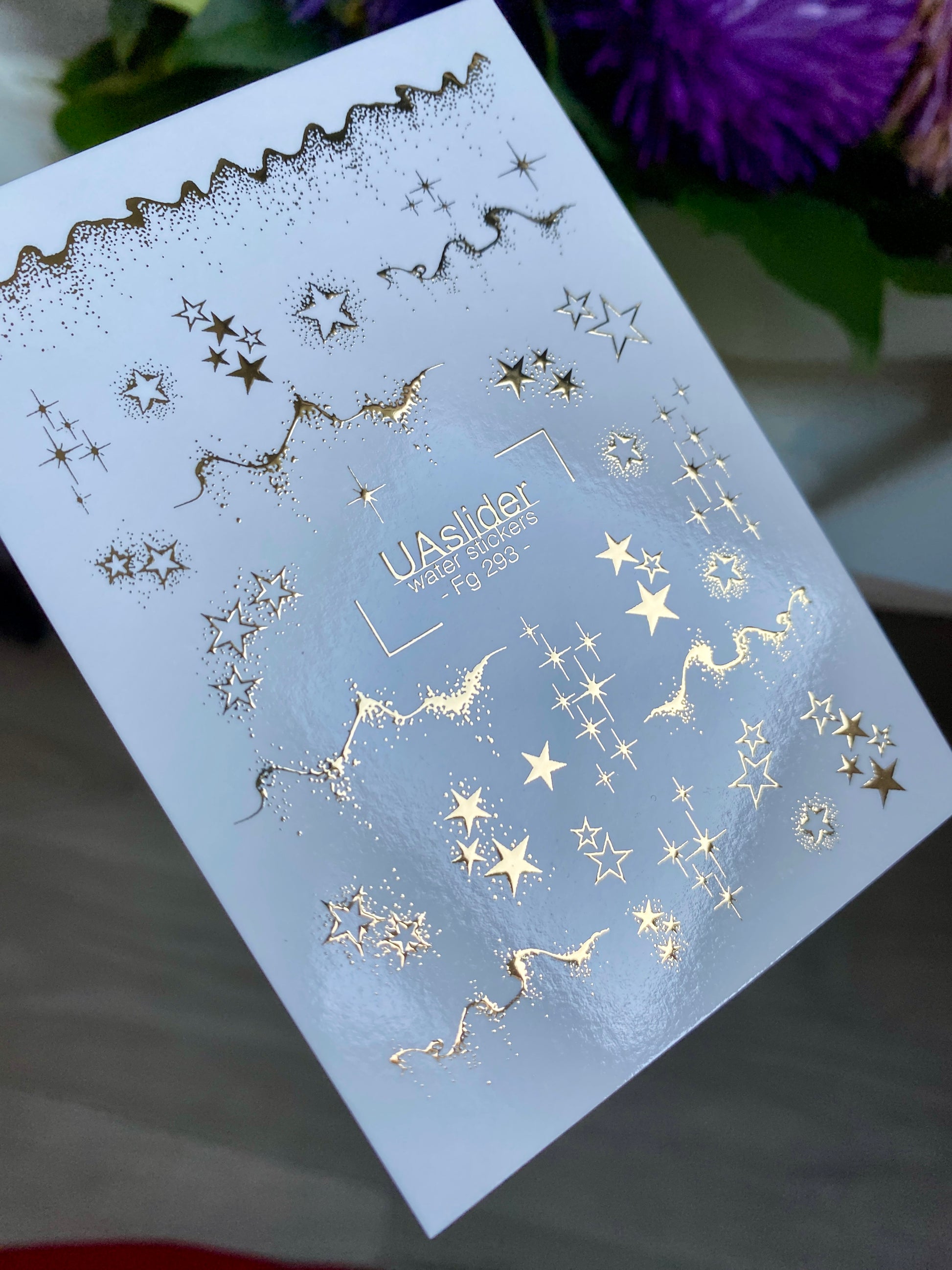 Nagel-Wasserabziehbild Fg-293 | Wasserabzieh-Nagelaufkleber mit goldenen Sternen | Elegantes sternenübersätes DesignFg_293