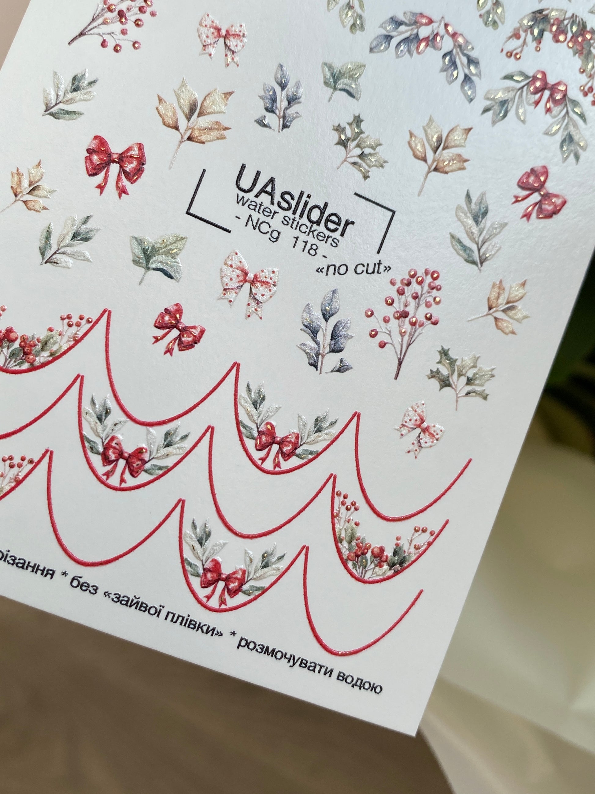 Festliche Wasserabziehbilder für Nägel mit Winterbeeren, Stechpalmenblättern und dekorativen Schleifen. Diese Nagel-Wasserabziehbilder werden durch Wasser aktiviert – tauchen Sie das Design einfach in Wasser und es gleitet mühelos auf die Nageloberfläche.