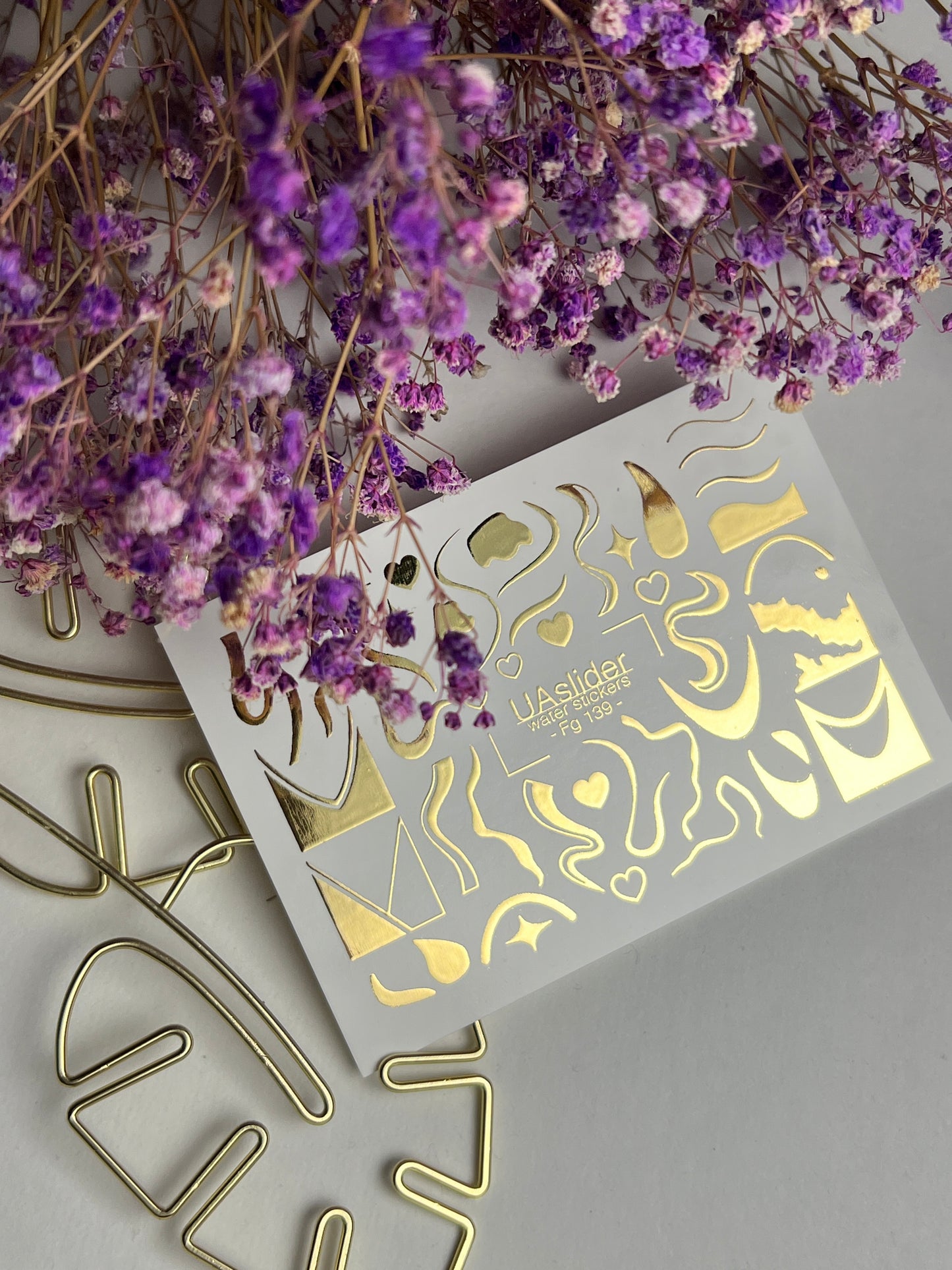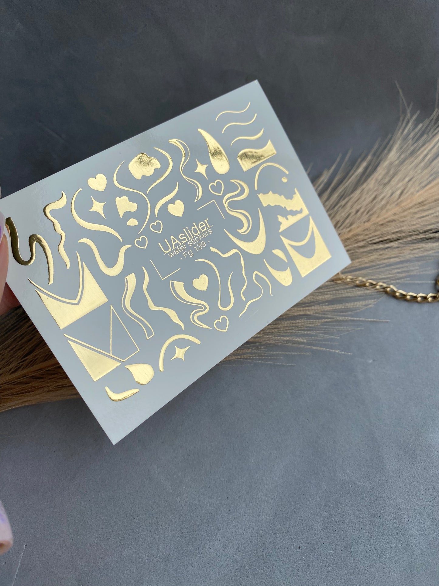 Acentos dorados únicos para uñas con ondas abstractas, corazones, gotas y formas geométricas. Estas calcomanías para uñas tipo water slide se aplican fácilmente con agua: corta la pieza deseada, remójala y transfiérela suavemente a la uña. Se puede usar agua tibia para mayor comodidad. Perfectas para crear manicuras artísticas y modernas.