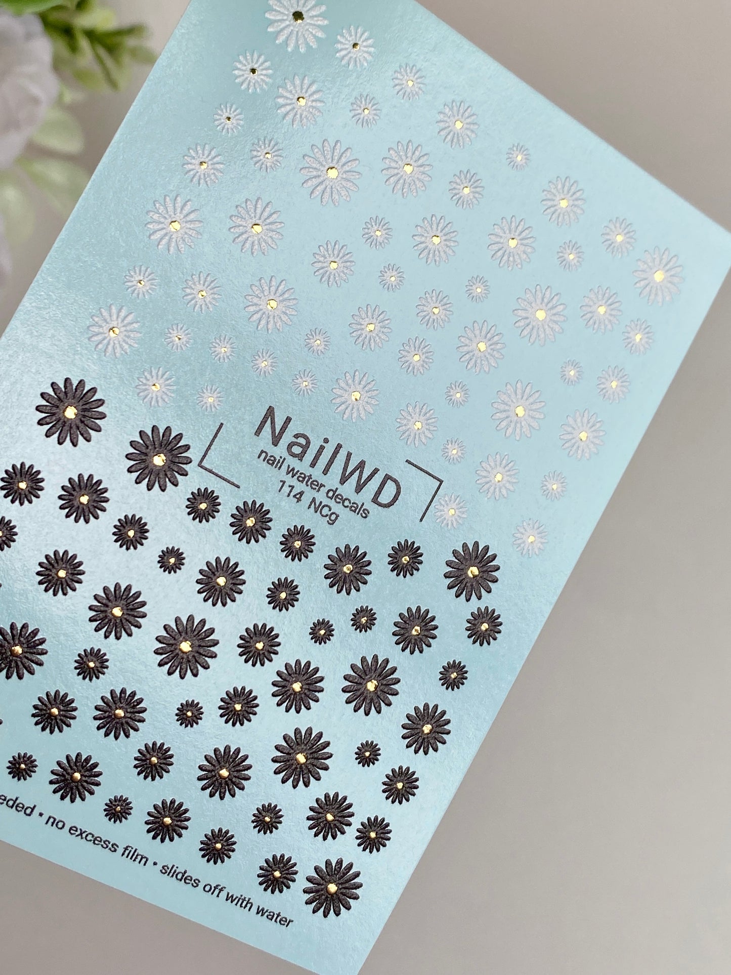 Décalcomanie d'eau pour ongles 114 NailWD | Décalcomanies à glissière d'eau pour ongles Marguerites blanches et noires | Art d'ongles floral minimaliste0114_NCg