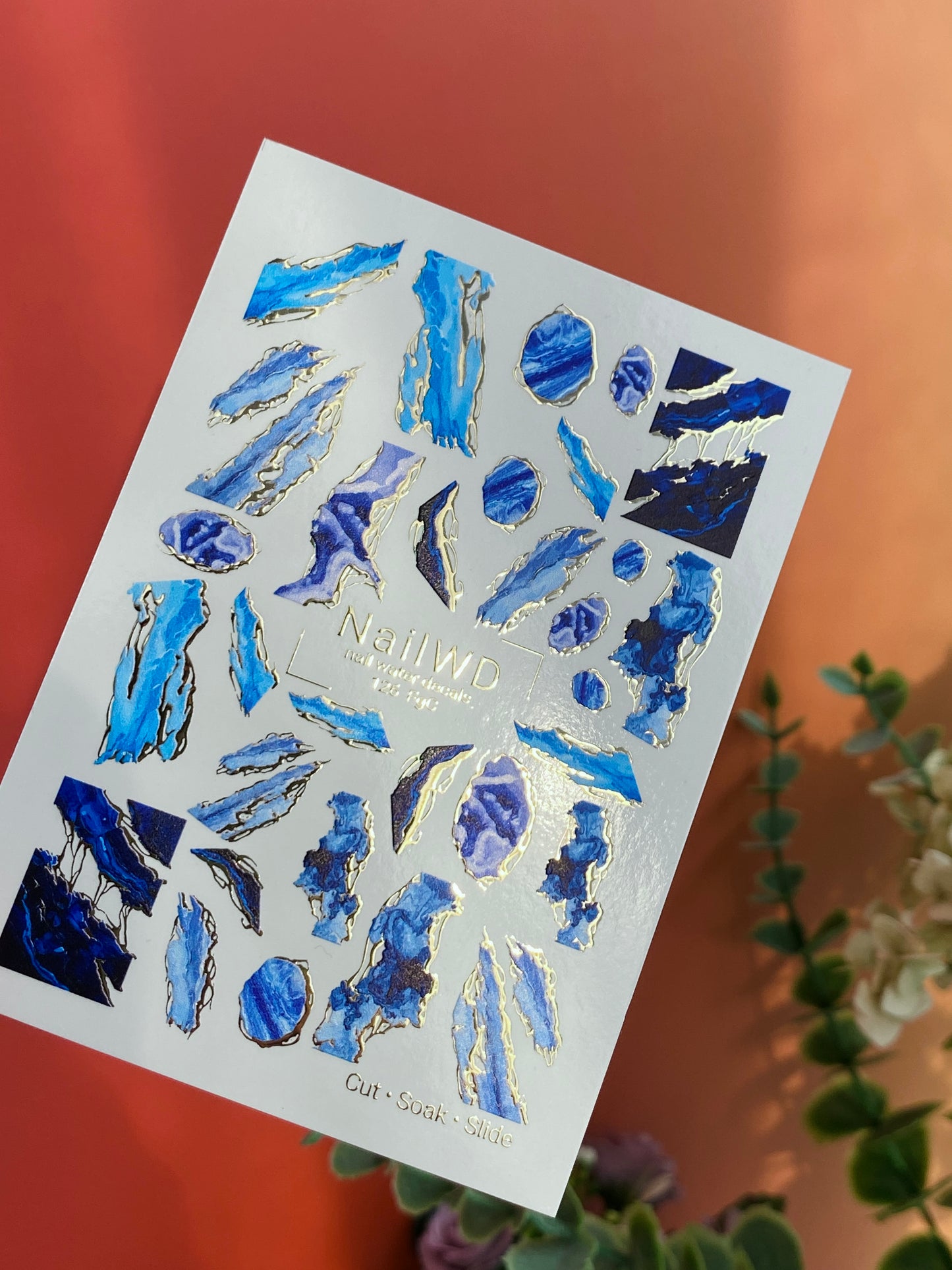 Superbes décalcomanies pour ongles en transfert d'eau en agate bleue avec des bords dorés scintillants pour un effet pierre précieuse luxueux. Ces décalcomanies pour ongles à transfert d'eau s'activent à l'eau — il suffit de les tremper pour les appliquer, chaque pièce se libère dans l'eau et glisse facilement sur l'ongle.