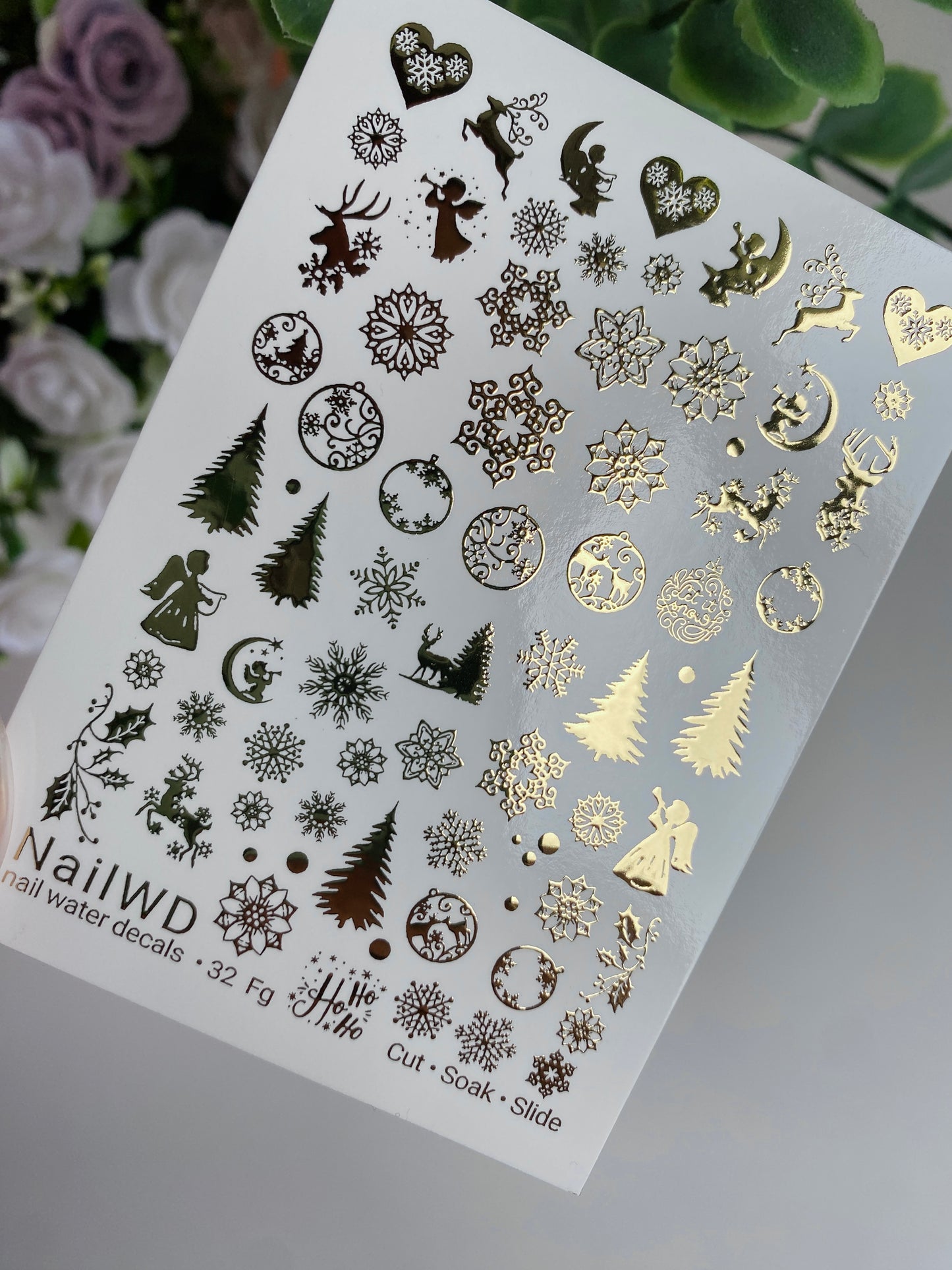 Décalcomanie d'eau pour ongles 32 NailWD | Décalcomanies à glissière d'eau de Noël pour ongles | Flocons de neige et arbres en feuille d'or