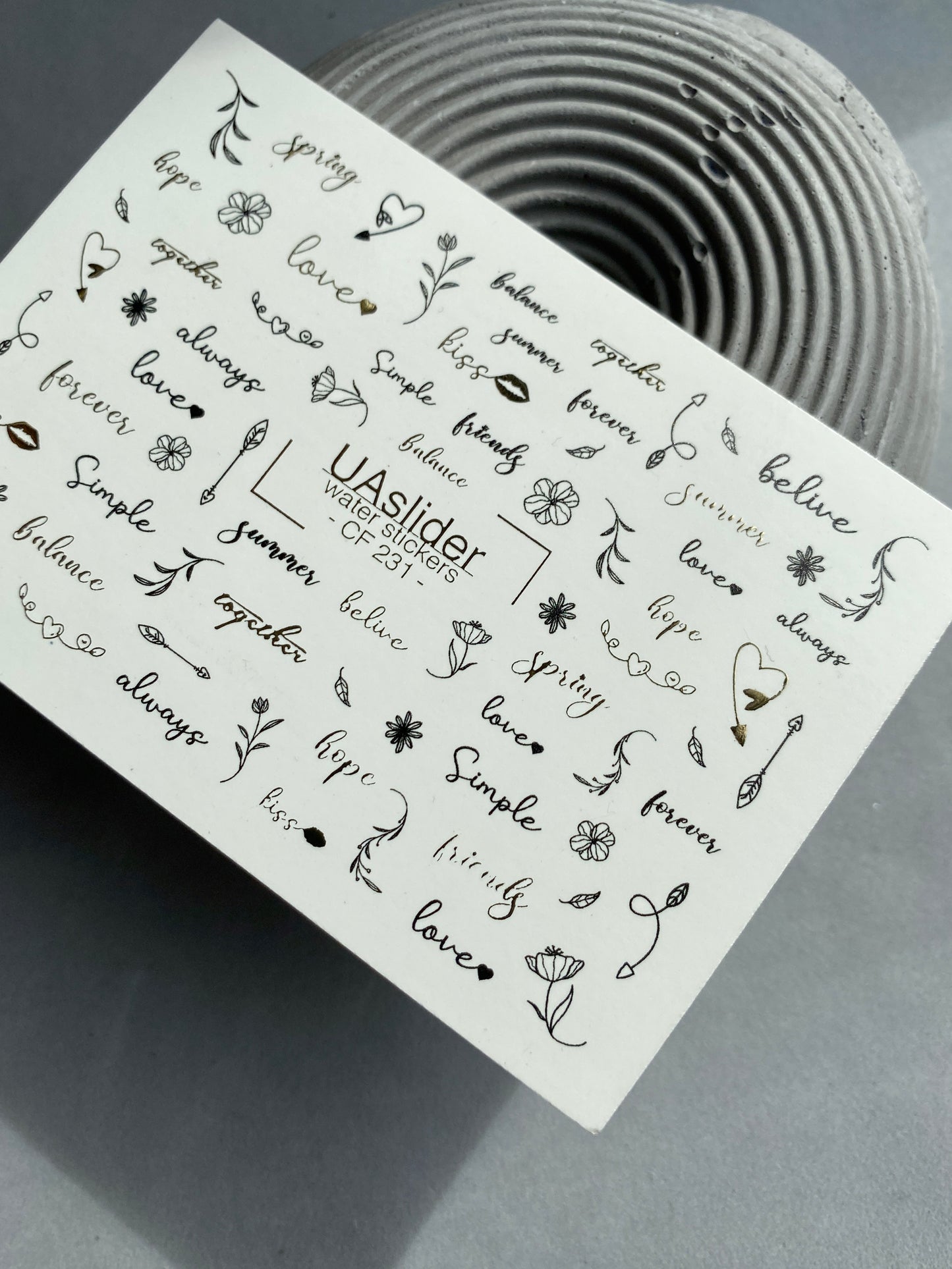 מדבקת מים לציפורניים CF-231 | מדבקות מים לציפורניים בסגנון מינימליסטי | אותיות, פרחים והדגשים בזהב