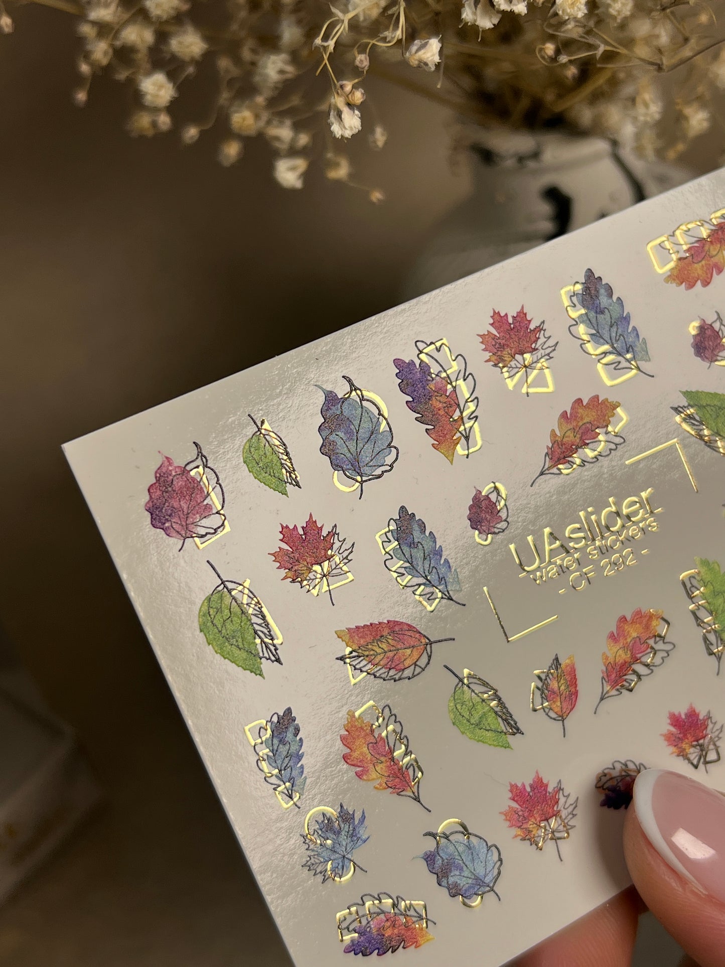 네일 워터 데칼 CF-292 | 무지개 가을 워터 슬라이드 네일 데칼 | 다채로운 가을 잎사귀 및 기하학적 악센트