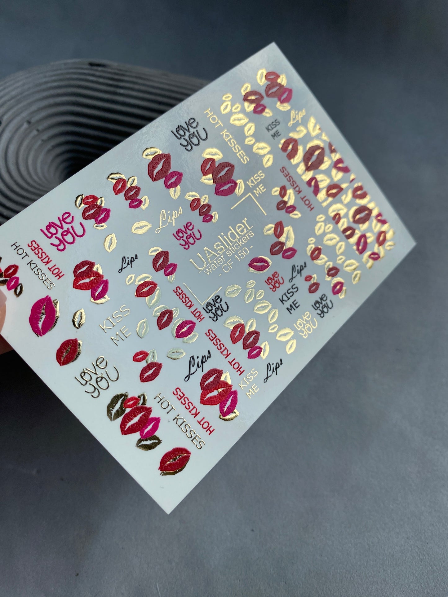 Adesivo para Unhas CF-150 | Adesivos Deslizantes para Unhas Kiss Print | Lábios Vermelhos, Frases de Amor e Folha Dourada