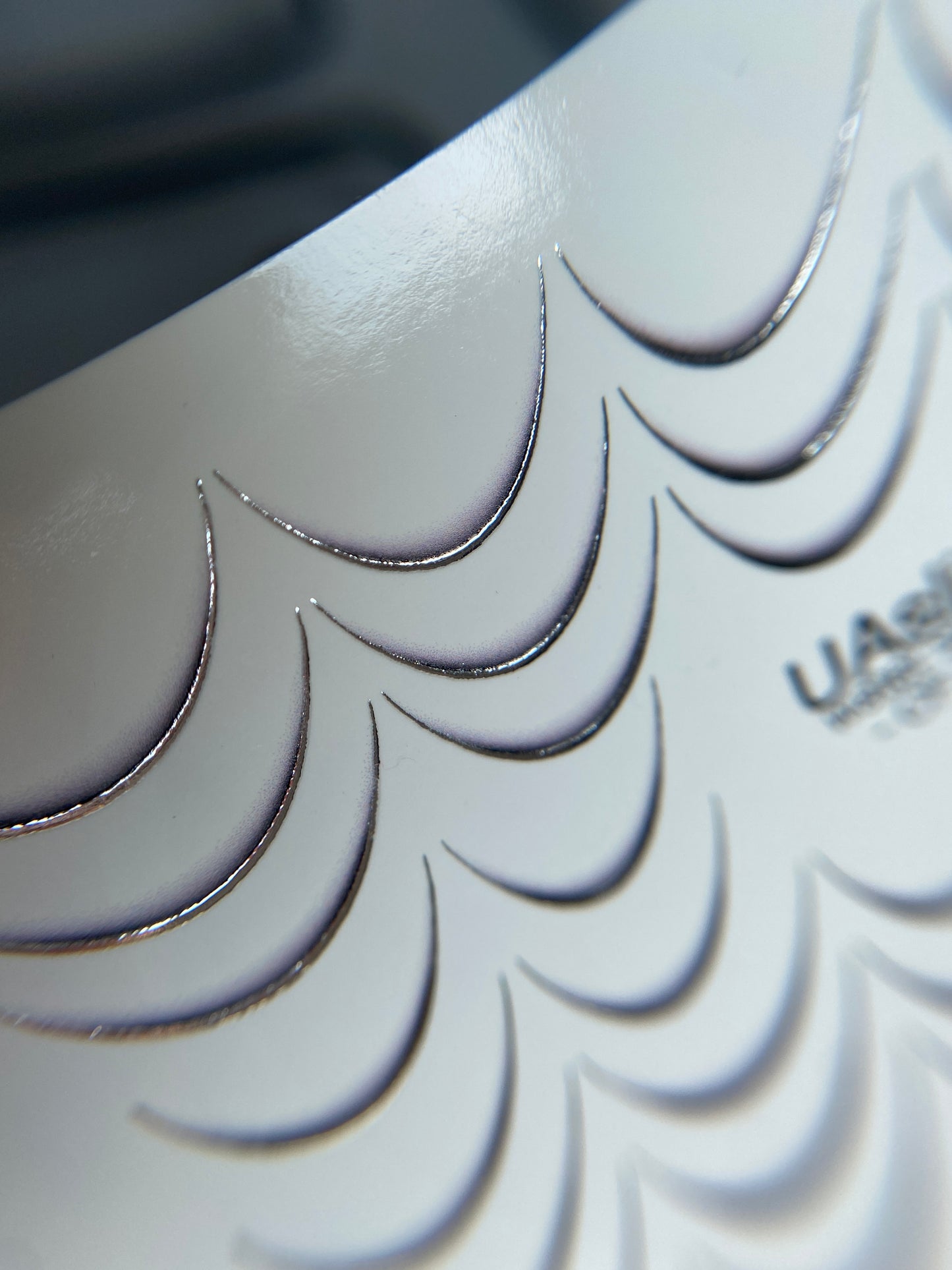 Decalcomanii franțeze pentru unghii cu linii curbate argintii elegante și un efect subtil de umbră. O alegere atemporală pentru crearea vărfurilor franțeze clasice sau a artei moderne minimaliste pentru unghii.