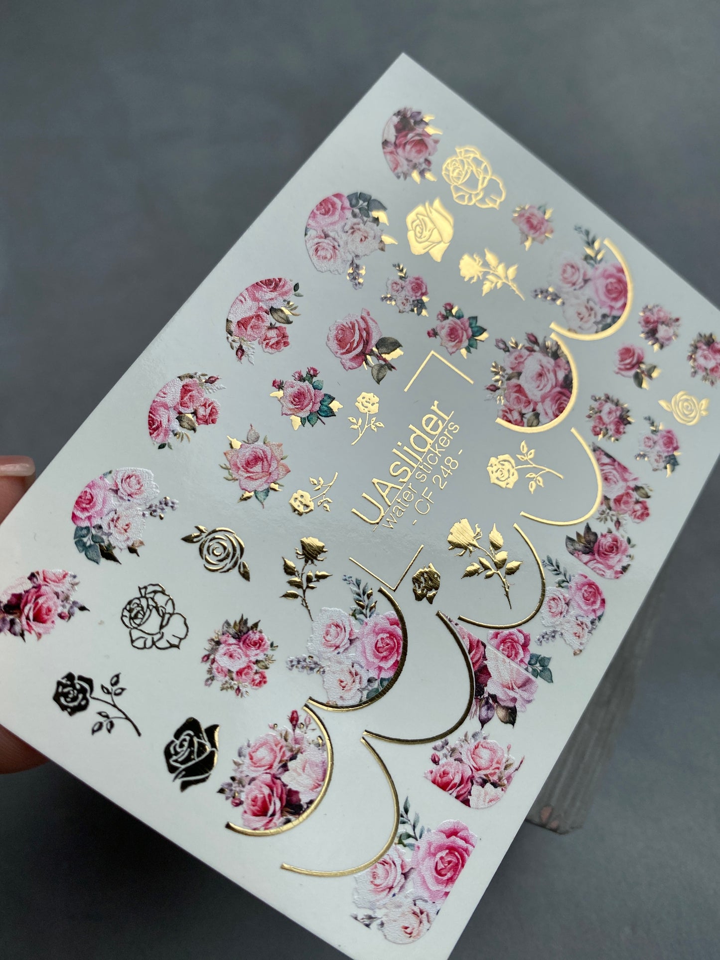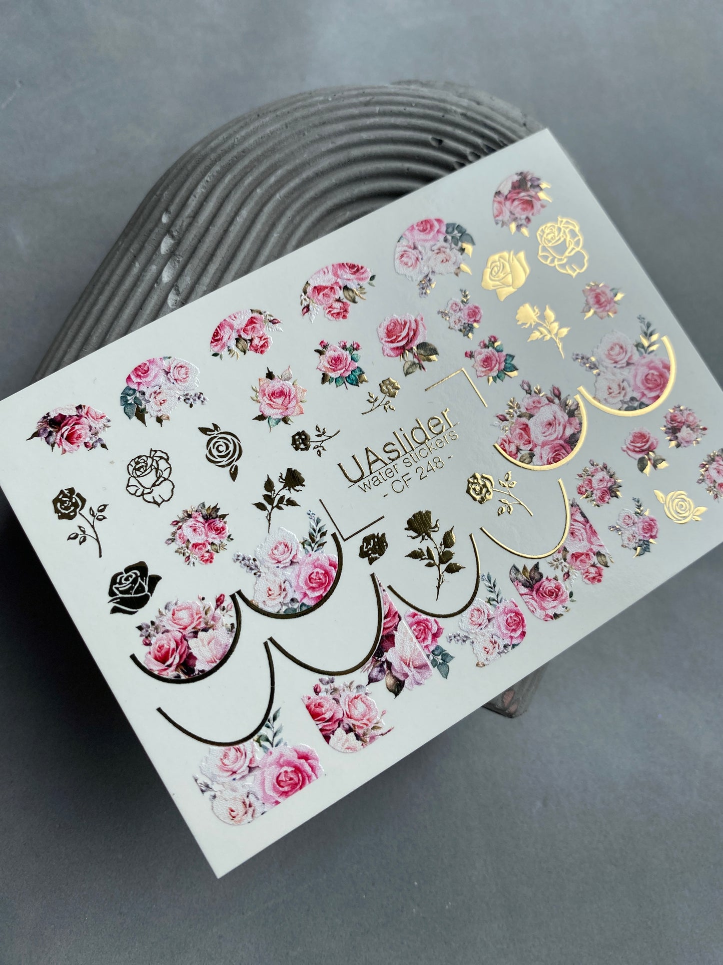 Tırnak Su Transferi CF-248 | Çiçekli Tırnak Su Transferleri | Altın Aksanlı Pembe Güller