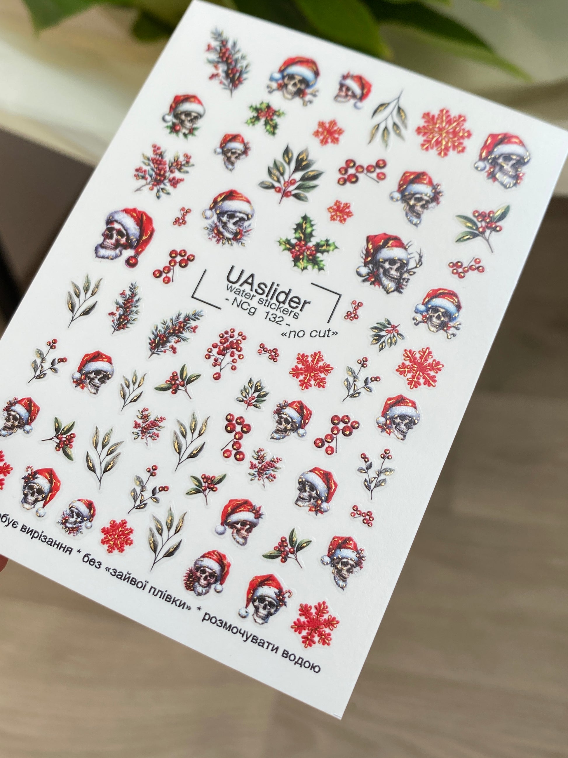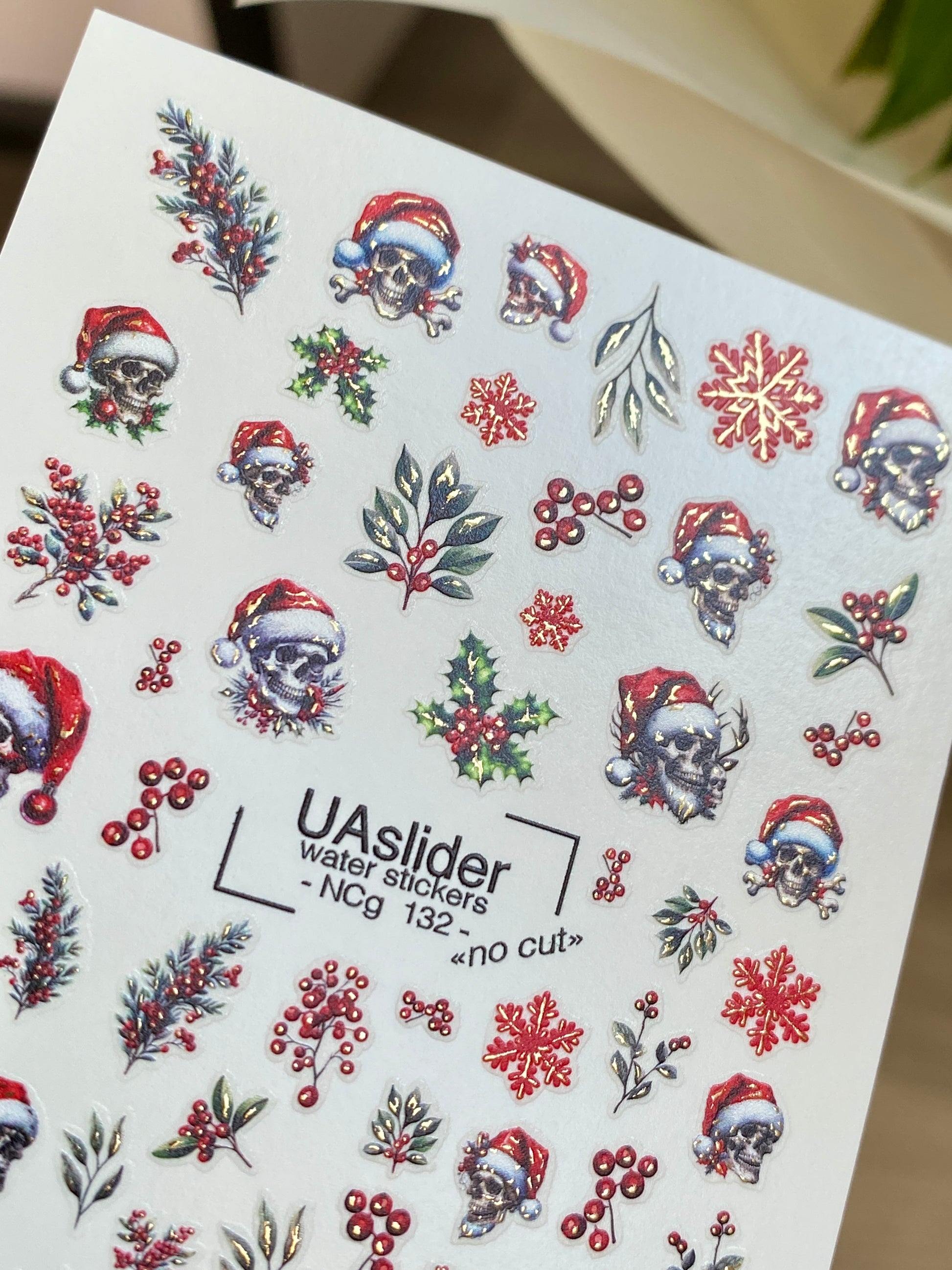 Kafatasları Noel şapkası, mersin yaprakları, meyveler ve şenlikli kar taneleri içeren cesur su kaydırmalı tırnak çıkartmaları. Bu su transfer tırnak çıkartmaları suyla aktive olur — uygulamak için ıslatın ve her tasarım tırnak yüzeyine kolayca kayar.