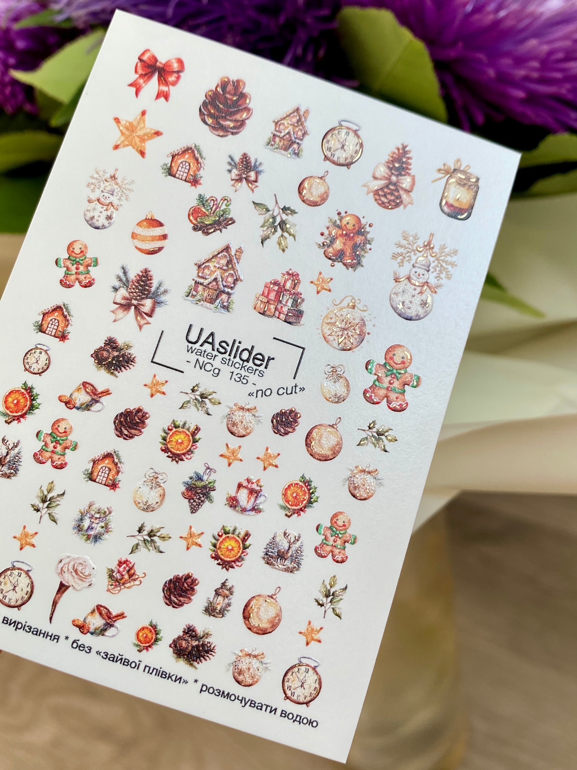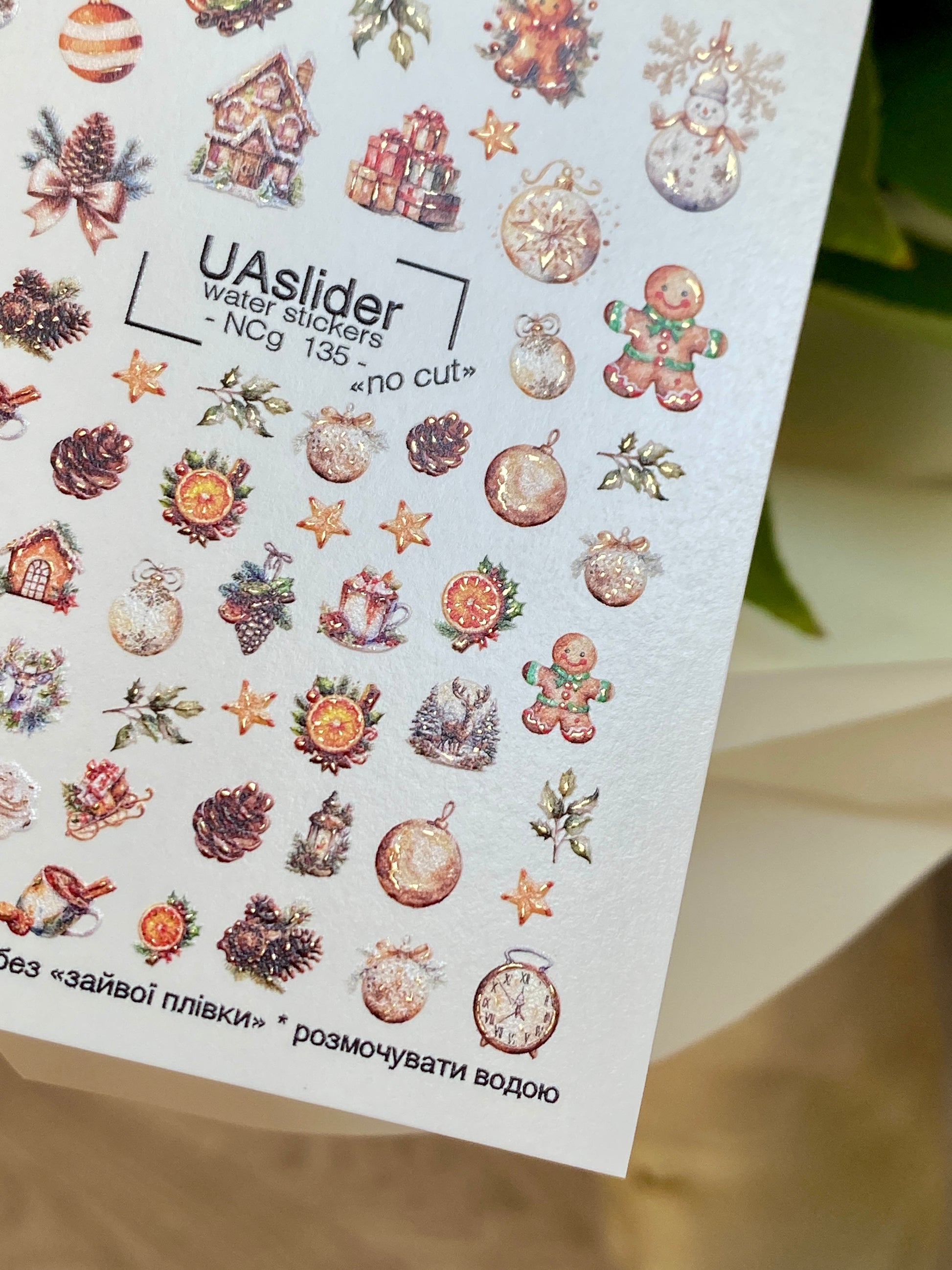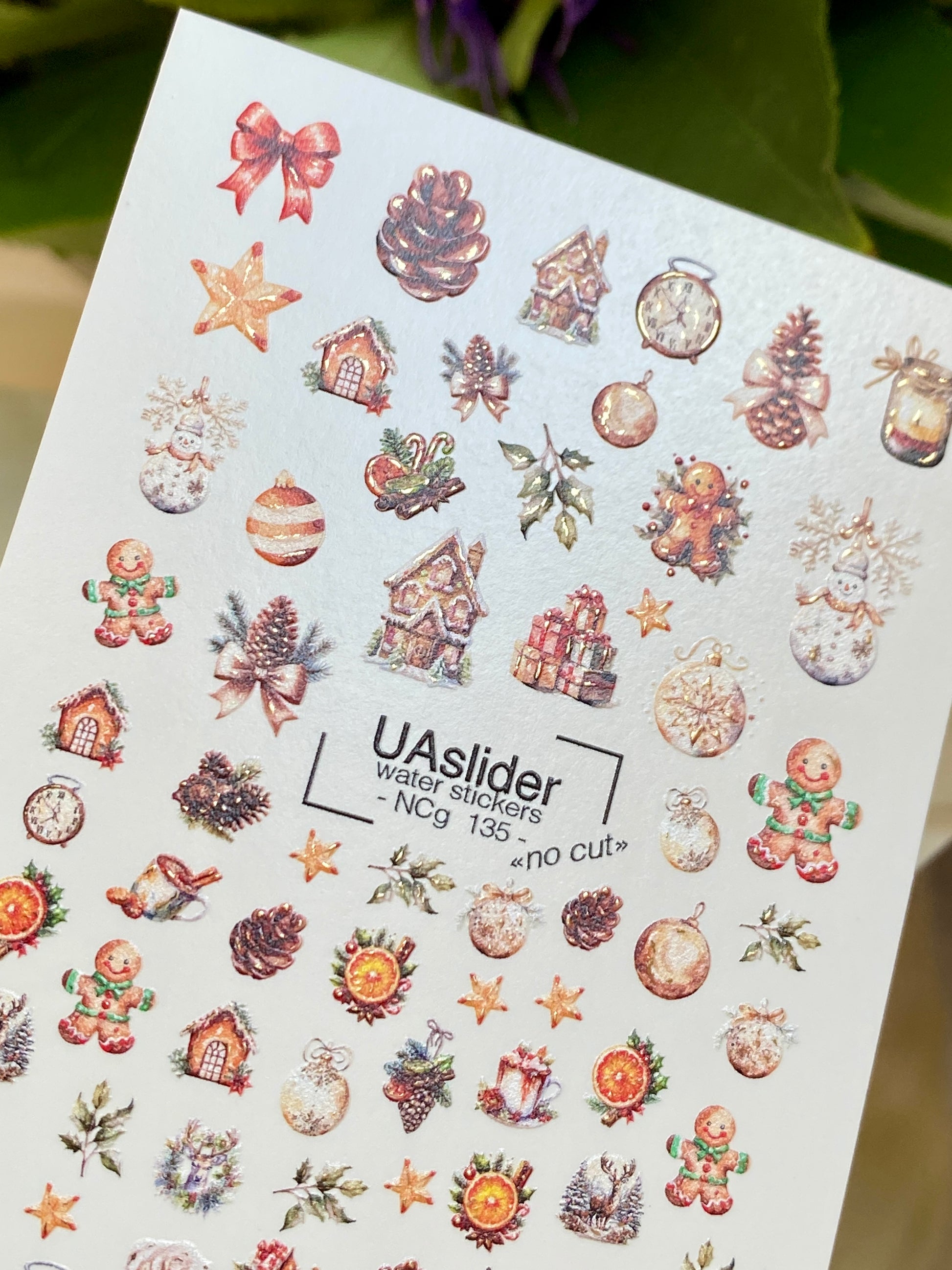 Zencefilli adamlar, Noel süsleri, çam kozalakları, saatler, yıldızlar ve şenlikli evler içeren büyüleyici su kaydırmalı tırnak çıkartmaları. Bu tırnak su çıkartmaları suyla aktive olur — uygulamak için ıslatın ve desenler kolayca tırnak yüzeyine transfer olur.