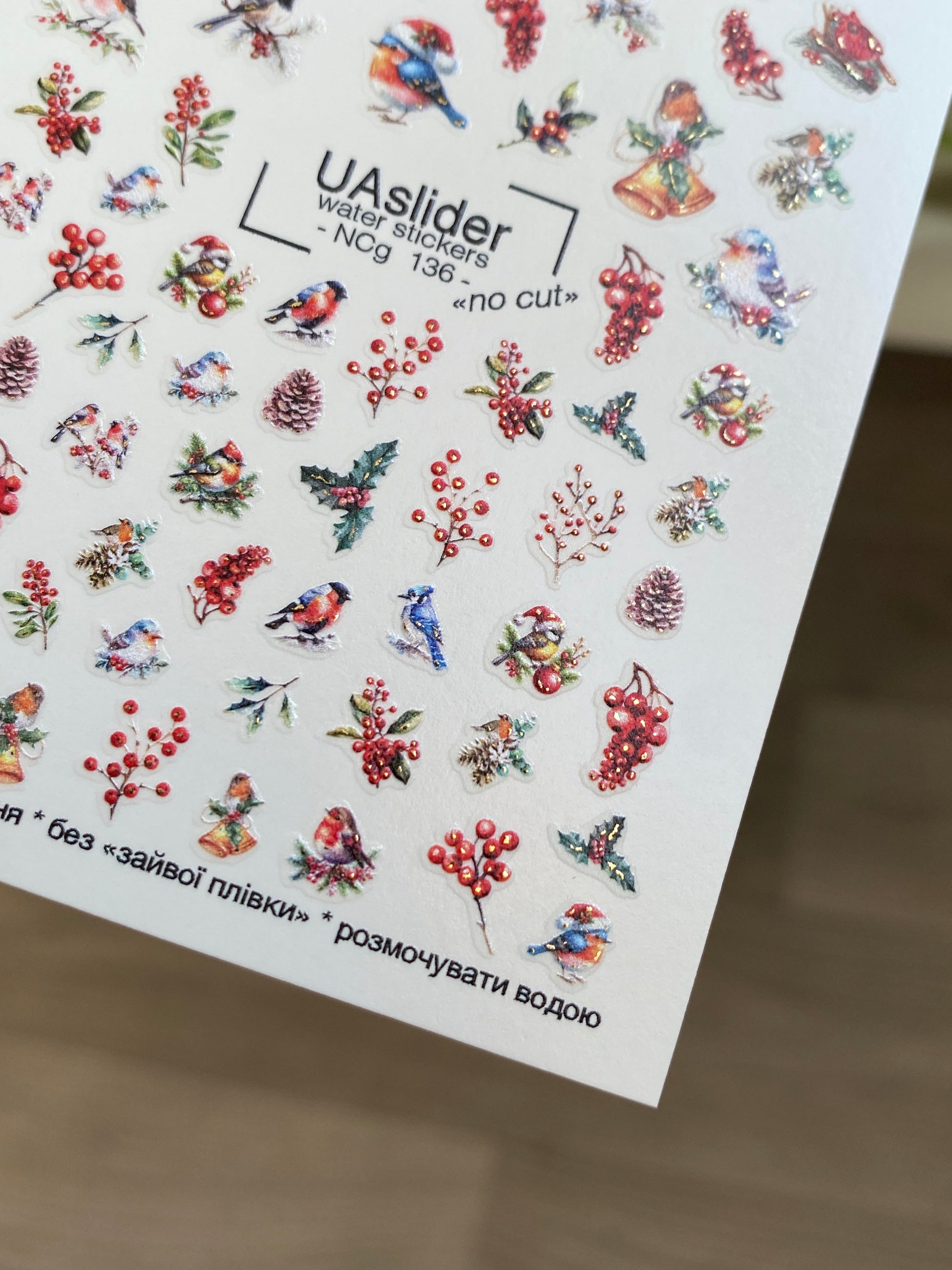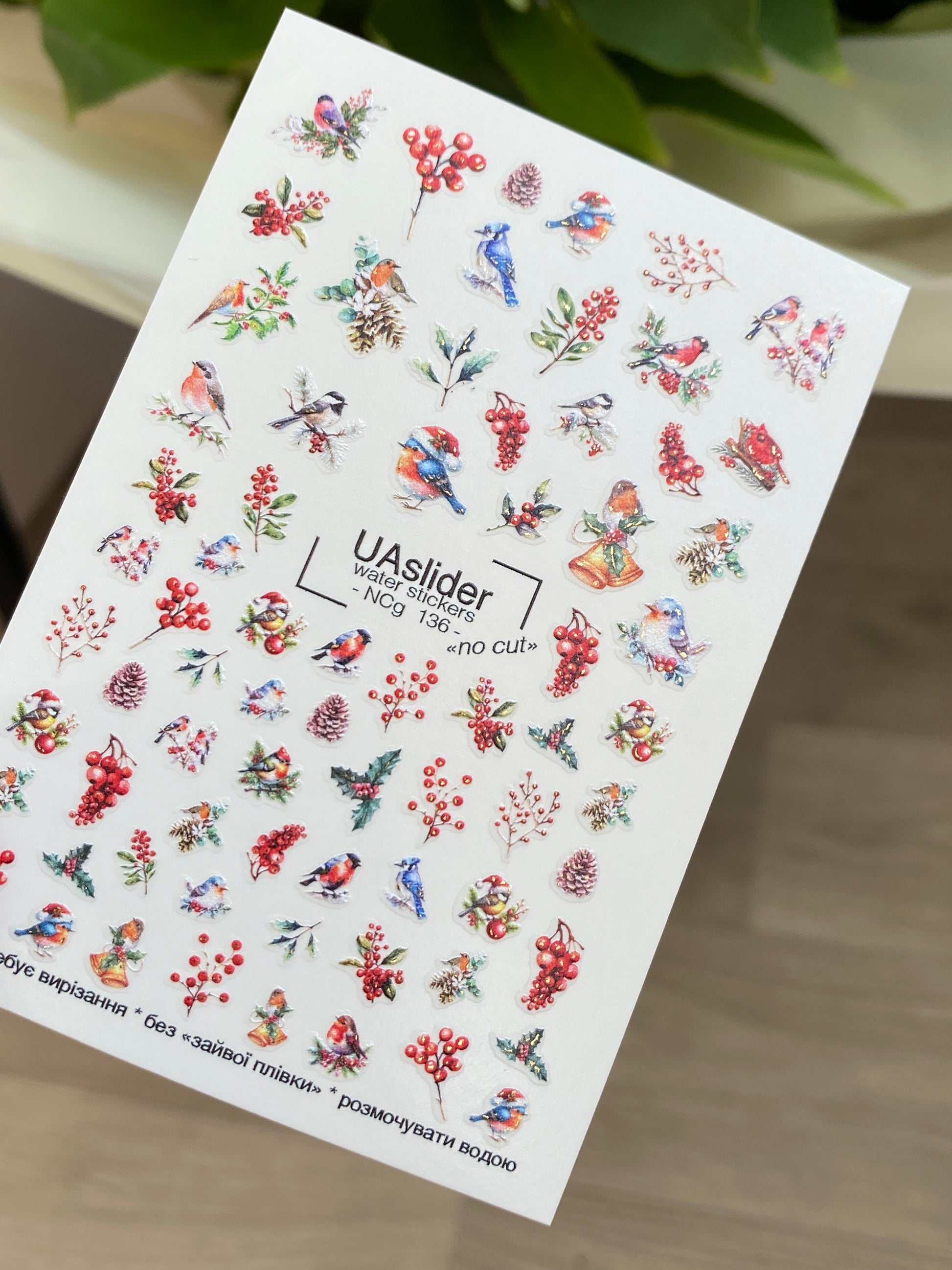 Kış kuşları, kırmızı meyveler, çobanpüskülü yaprakları ve çam kozalakları içeren narin su kaydırmalı tırnak çıkartmaları. Bu tırnak su çıkartmaları suyla aktive olur — uygulamak için ıslatın ve desenler tırnak yüzeyine kolayca kayar.